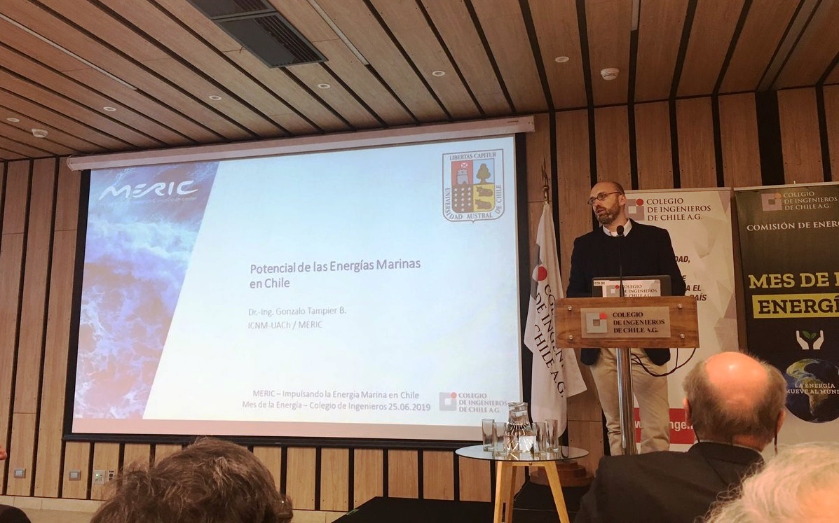 A fines de junio, Gonzalo Tampier, investigador líder de la línea “Adaptación de Tecnologías” del Centro de Investigación e Innovación en Energía Marina (MERIC), fue parte del grupo de expertos que expusieron en el marco de las actividades de conmemoración del “Mes de la Energía”, organizadas por el Colegio de Ingenieros de Chile.