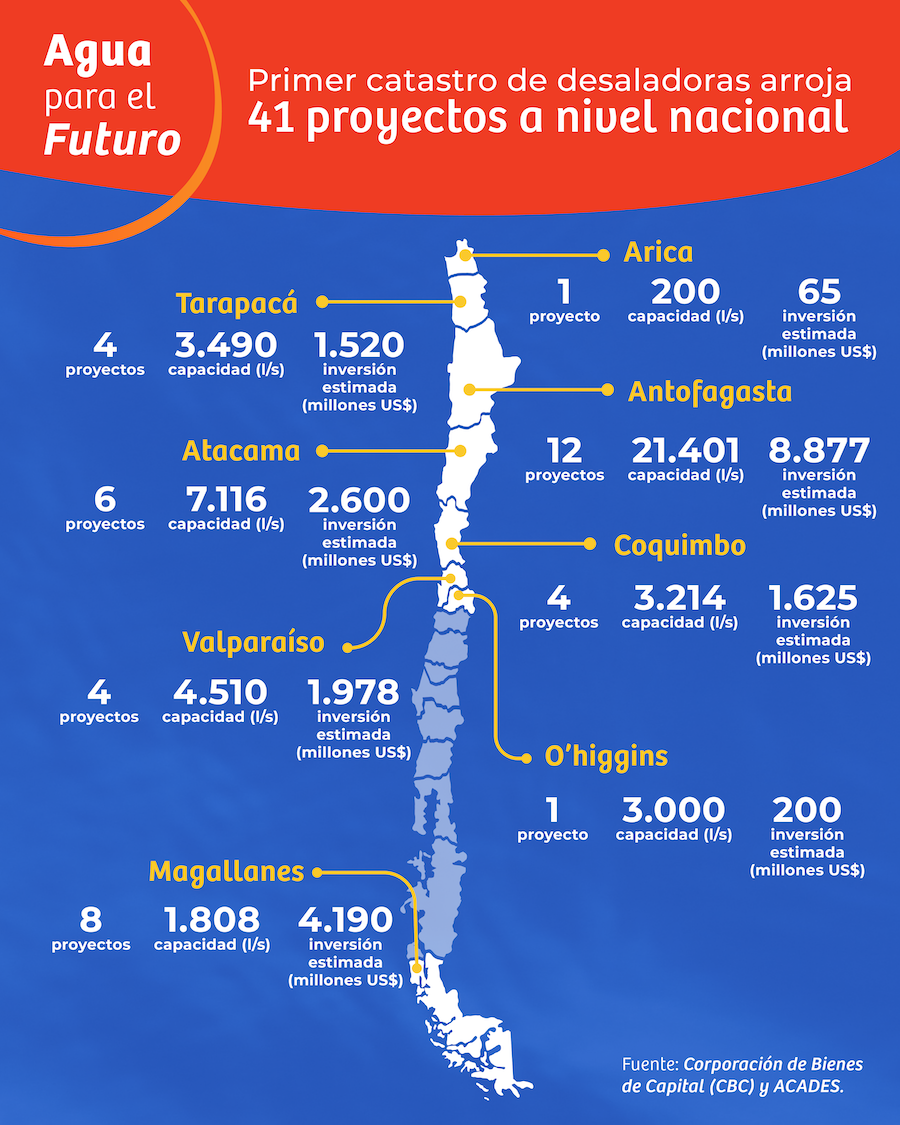 La Asociación Chilena de Desalación y Reúso (ACADES), en conjunto con la Corporación de Bienes de Capital (CBC), presentó un nuevo catastro sobre proyectos de fuentes no convencionales de agua en el país. Este revela que, a marzo de 2025, se registran 41 proyectos en etapas de ingeniería o construcción relacionados con el reúso de aguas residuales y con la extracción, transporte y desalación de agua de mar, entre otros. Los 41 proyectos representan una inversión total estimada de USD 22.159 millones y la utilización y transporte de 45.239 l/s. De ellos, 15 suministrarán agua exclusivamente a operaciones mineras, 12 a la producción de hidrógeno o amoníaco verde, 11 son multipropósito-minero y 3 multipropósito-consumo humano.