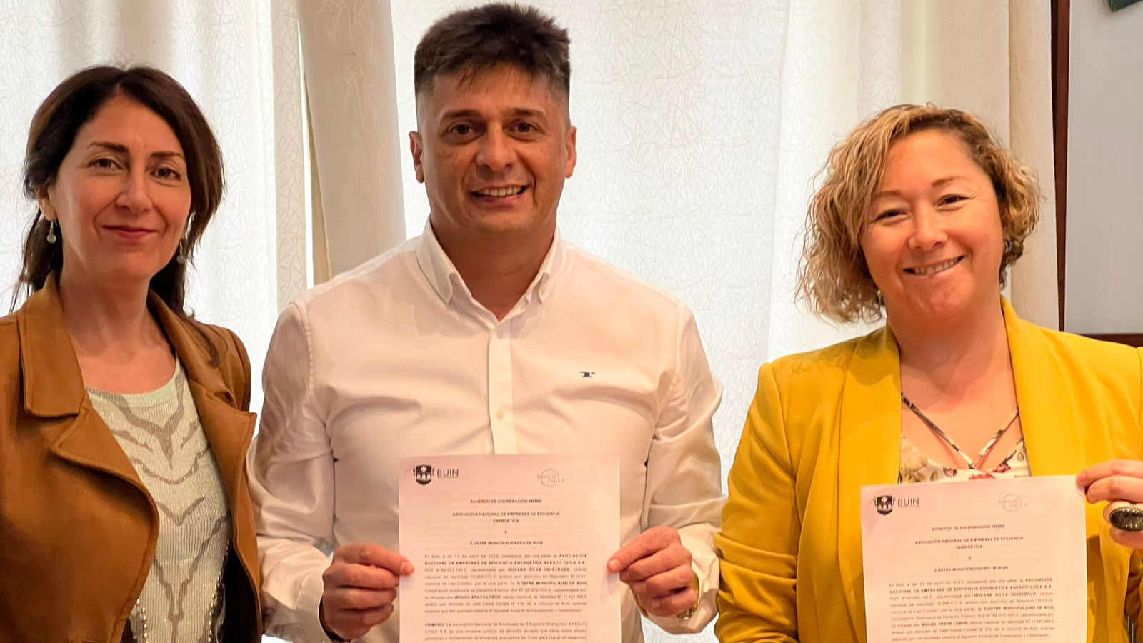 Una firma de convenio entre la Ilustre Municipalidad de Buin y la Asociación de Eficiencia Energética Anesco Chile A.G., se llevó a cabo este miércoles en las dependencias de dicho municipio junto al alcalde de la comuna, Miguel Araya, y la presidenta de Anesco Chile, Roxana Silva.