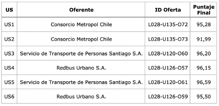 La Comisión de Apertura y Evaluación, que se ajustó a las exigencias establecidas en las bases de licitación, analizó las 16 ofertas económicas entregadas y propuso adjudicar las 6 Unidades de Servicios en concurso. El Acta de Evaluación Económica y Final está disponible en: https://www.dtpm.cl/index.php/del-proceso-de-licitacion-n-lp-cuv001-2019