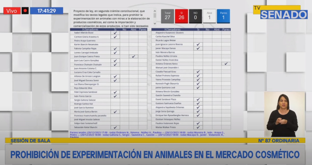 Luego de años de campaña, el proyecto de ley que tiene como objetivo prohibir la experimentación en animales para cosmética, así como la importación de productos e ingredientes testeados en animales al país, fue votado este 20 de diciembre por la sesión plena del Senado presidida por Juan Antonio Coloma, y aprobado por unanimidad con 27 votos a favor, 0 en contra y 1 abstención. El proyecto se enviará a la Cámara de Diputadas y Diputados para comunicarle al Ejecutivo la aprobación del Congreso.