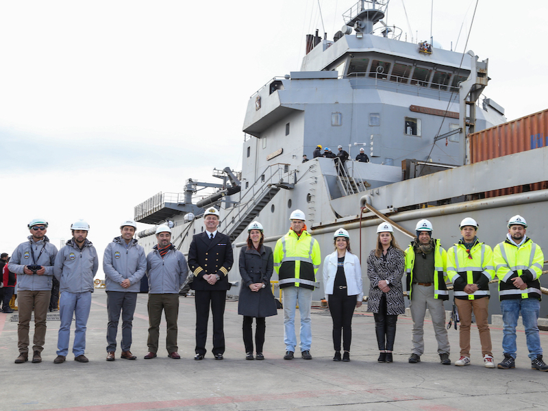 A la izquierda (y en portada) las primeras imágenes que se reportan desde el continente blanco en el marco de la Campaña Antártica 2023-2024. A la derecha, la unidad naval AP Aquiles, previo al zarpe, con profesionales de Corfo, Armada de Chile, AndesVolt y Saesa Innova.