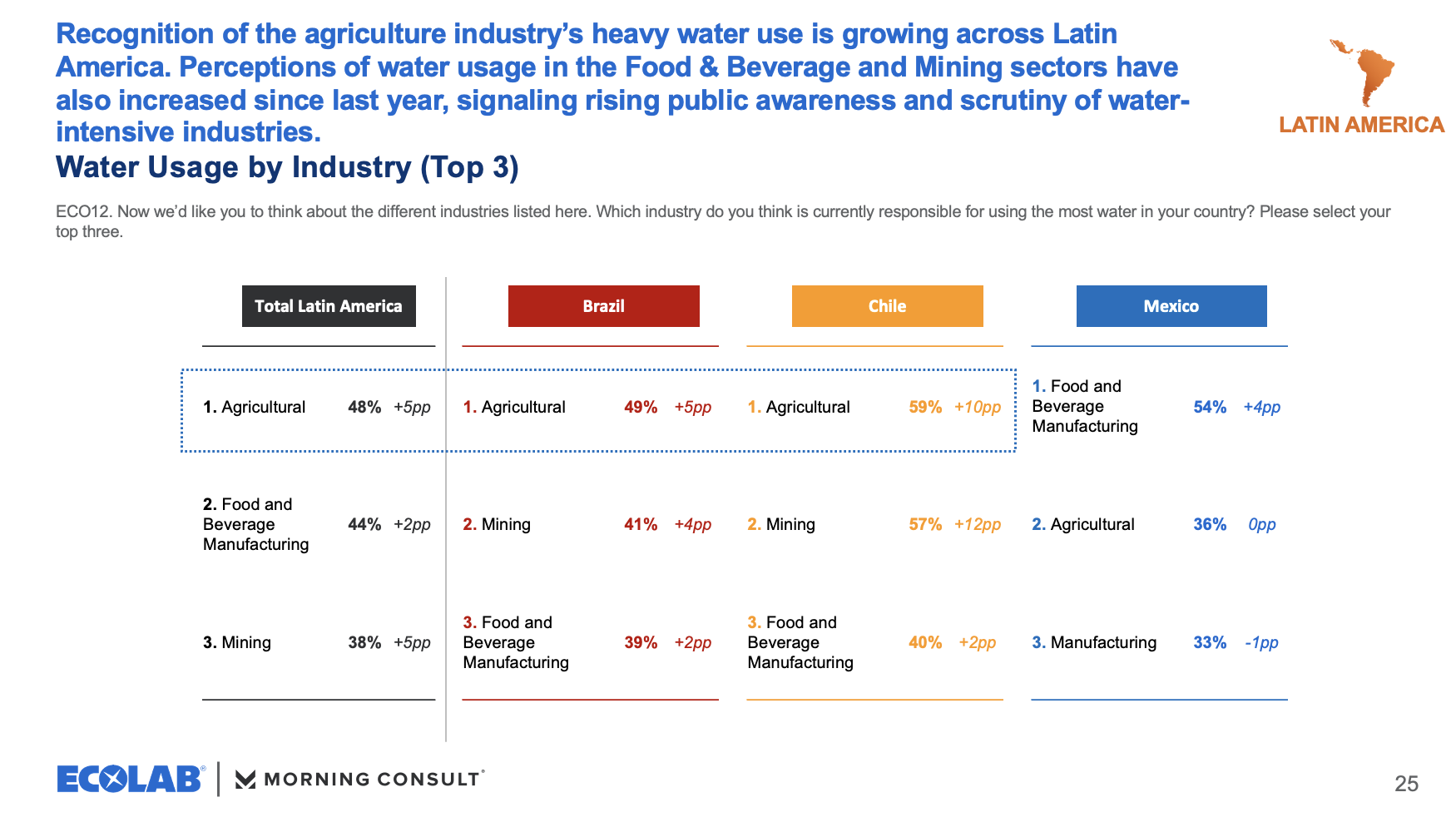 Un tema central considerando que, según el estudio Ecolab Watermark 2024, la minería es percibida por los chilenos como el sector que más agua utiliza: 57% de la población cree que es la industria con mayor consumo hídrico en el país.