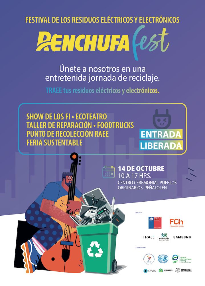 Renchúfafest será la última campaña ciudadana de recolección y valorización de RAEE del proyecto Residuos-E, que culmina este año, y que ha sido impulsado desde 2019 por Fundación Chile y el Ministerio del Medio Ambiente. Para este “broche de oro”, contará con la colaboración de la Municipalidad de Peñalolén, como organizador del evento; de la empresa Samsung, y de TRAEE, futuro Sistema de Gestión Colectivo para RAEE, a cargo de la Cámara de Comercio de Santiago.