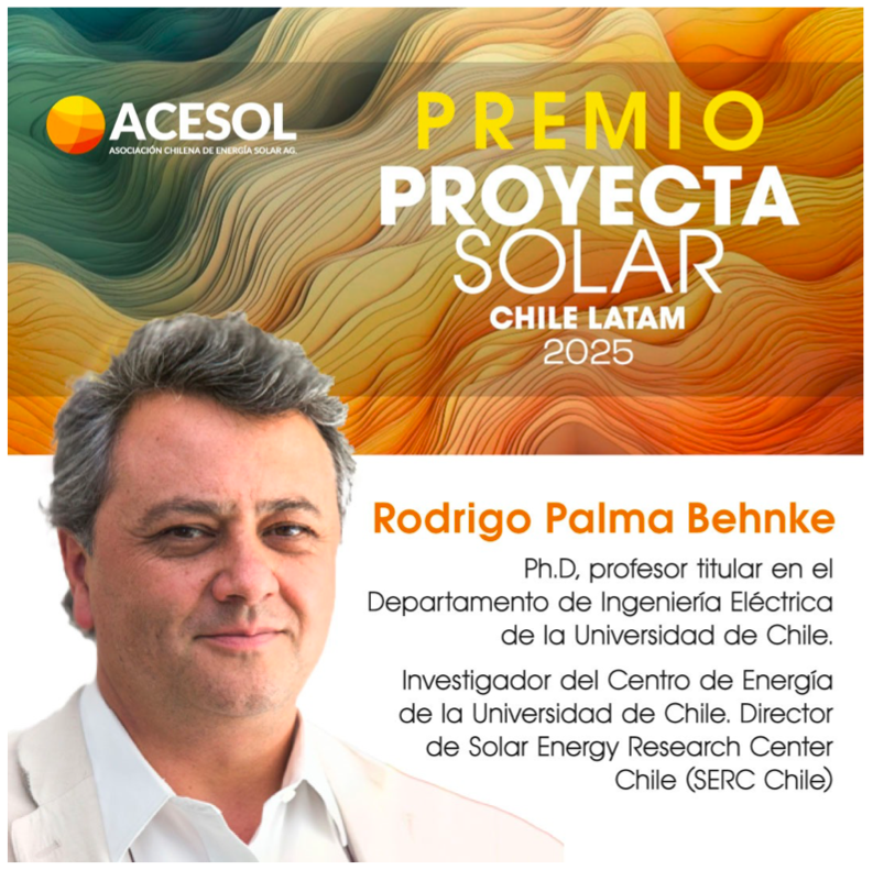 El reconocimiento fue anunciado desde ACESOL AG, quienes señalaron que “en esta edición 2025, el Premio Proyecta Solar será otorgado a Rodrigo Palma Behnke, Ph.D., profesor titular del Departamento de Ingeniería Eléctrica de la Universidad de Chile, investigador del Centro de Energía de la misma casa de estudios y director del Solar Energy Research Center Chile (SERC Chile)”.