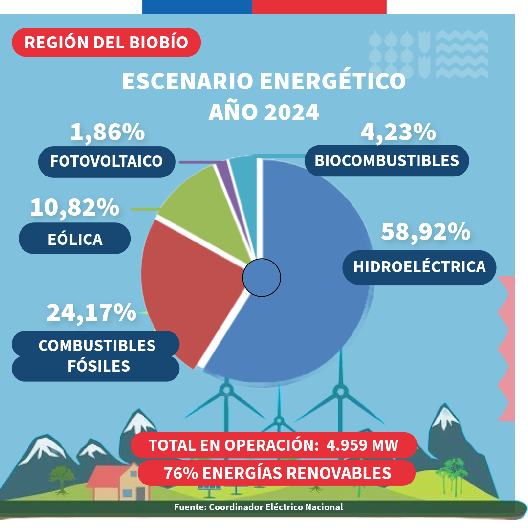 Con una inversión significativa en infraestructura y tecnología, se espera que la Región del Biobío experimente un aumento notable en la capacidad de generación de energía renovable durante este 2024. Actualmente la capacidad instalada de generación es de 4.959 MW, siendo un 76% de fuentes de energías renovables. En base a lo anterior, se proyecta que las energías limpias representen una parte cada vez mayor de la matriz energética regional, con un enfoque particular en la energía solar y eólica, las cuales hasta la fecha representan un 1,9% y un 10,9% de la capacidad instalada, respectivamente.