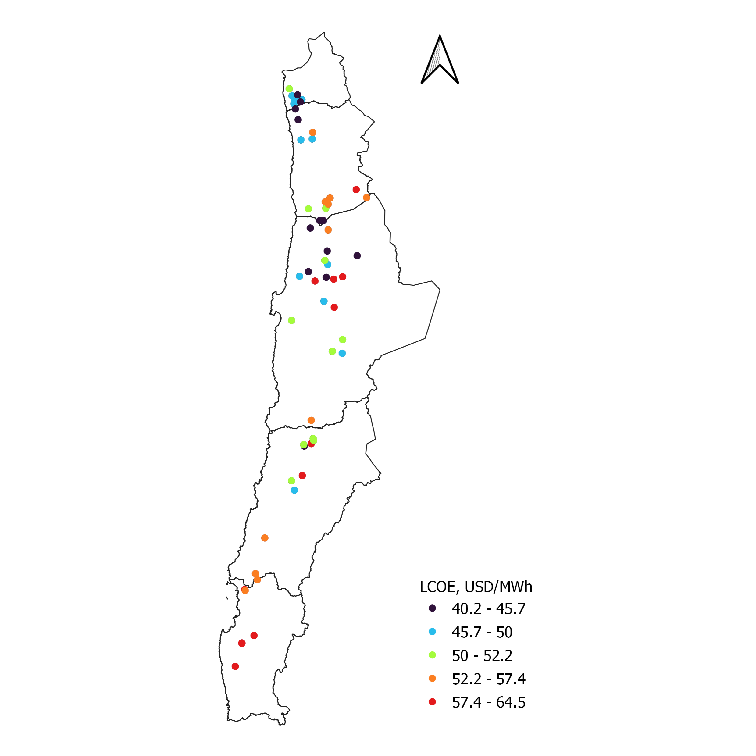La investigadora Catalina Hernández, líder del equipo EHV, destacó que “en primer lugar, se observa que existen zonas con mayor potencial de producción de hidrógeno, influenciado principalmente por sus correspondientes niveles de irradiación solar global o directa (dependiendo de la tecnología), principalmente entre las regiones de Arica y Parinacota y la región de Antofagasta”.
