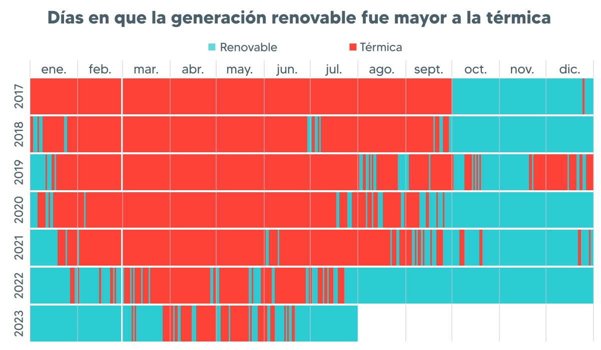 El 2023 continúa sorprendiendo en lo que respecta a la transición energética del sector eléctrico. A julio de 2023, el 71% de los días, la generación renovable superó a la térmica. Este hecho contrasta con lo ocurrido durante el mismo periodo de 2017, en que ningún día la generación renovable logró superar la generación térmica. Desde que se tiene registros con este nivel de detalle (1999), la generación renovable no había superado en más de un 50% de los días a la térmica en este periodo.