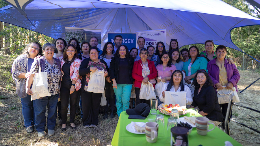 La directora Regional de la Fundación Prodemu, Paula Marín Fuentes, el alcalde de la Ilustre Municipalidad de Quilleco, Rodrigo Tapia, el gerente general de Innergex Energía Renovable, Jaime Pino Cox, el gerente de Sostenibilidad y Asuntos Corporativos de Innergex, Alejandro Donoso, y la jefa de Protección de Incendios y Asuntos Comunitarios de Comaco, junto a las beneficiadas del Programa Juntas Crecemos.