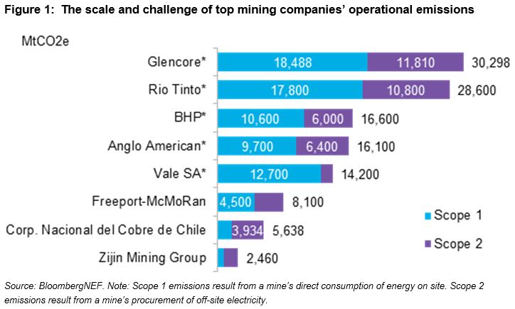 Según afirma Bloomberg NEF, la industria minera representa el 22% de las emisiones industriales globales, por lo que se enfrentan a más presión para descarbonizar que nunca: de los inversores, de los clientes en las industrias de tecnología y automotriz, e incluso de los consumidores más abajo. Las empresas reconocen los riesgos para sus operaciones del cambio climático y continúan reafirmando su compromiso con la sostenibilidad. Unas 21 empresas mineras, incluidas Glencore, Rio Tinto, BHP, Vale y Anglo American, son miembros del grupo de trabajo sobre divulgaciones financieras relacionadas con el clima, o TCFD. Esto significa que su información financiera revela riesgos y oportunidades del cambio climático. El siguiente paso para muchas de estas empresas es implementar cambios para impulsar la descarbonización directa, una tarea desalentadora.