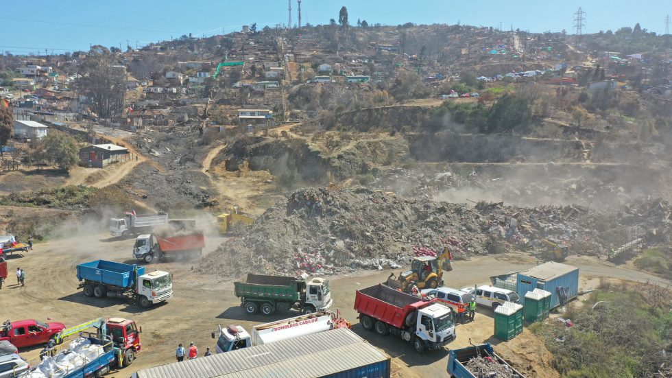 Para fines de febrero, las autoridades del Ministerio de Obras Públicas (MOP) informaban que se había terminado la primera etapa de remoción de escombros tras los incendios en Viña del Mar, Quilpué y Villa Alemana. Fueron un total de 85.000 toneladas las recogidas, de acuerdo a lo señalado en Radio Pauta por el seremi del Ministerio de Obras Públicas (MOP) de Valparaíso, Yanino Riquelme. Esta cifra significaba solo el 70% de la tarea total, según datos del gobierno, y fueron destinados el relleno sanitario El Molle.