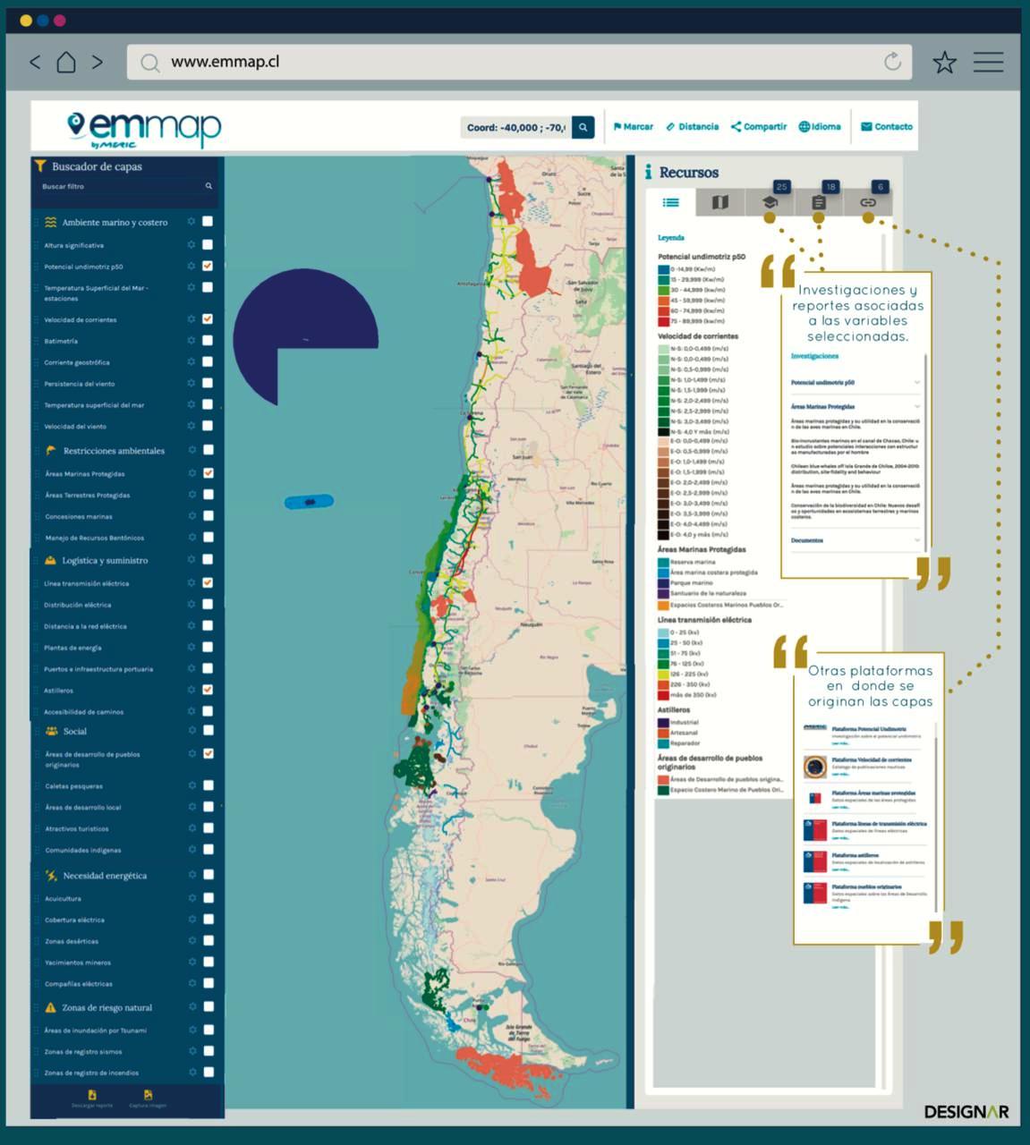 A través de encuestas y actividades relacionadas con la experiencia del usuario, aplicadas a actores nacionales e internacionales ligados a la energía marina, el sitio pudo ser diseñado conjuntamente con el usuario final. Esta retroalimentación permitió validar su utilidad e identificar la necesidad de contar con información centralizada y de fácil acceso, construyendo cinco categorías: Ambiente Marino y Costero, Restricciones Ambientales, Logística y Suministro, Social, Necesidad Energética y Zonas de Riesgo Natural.
