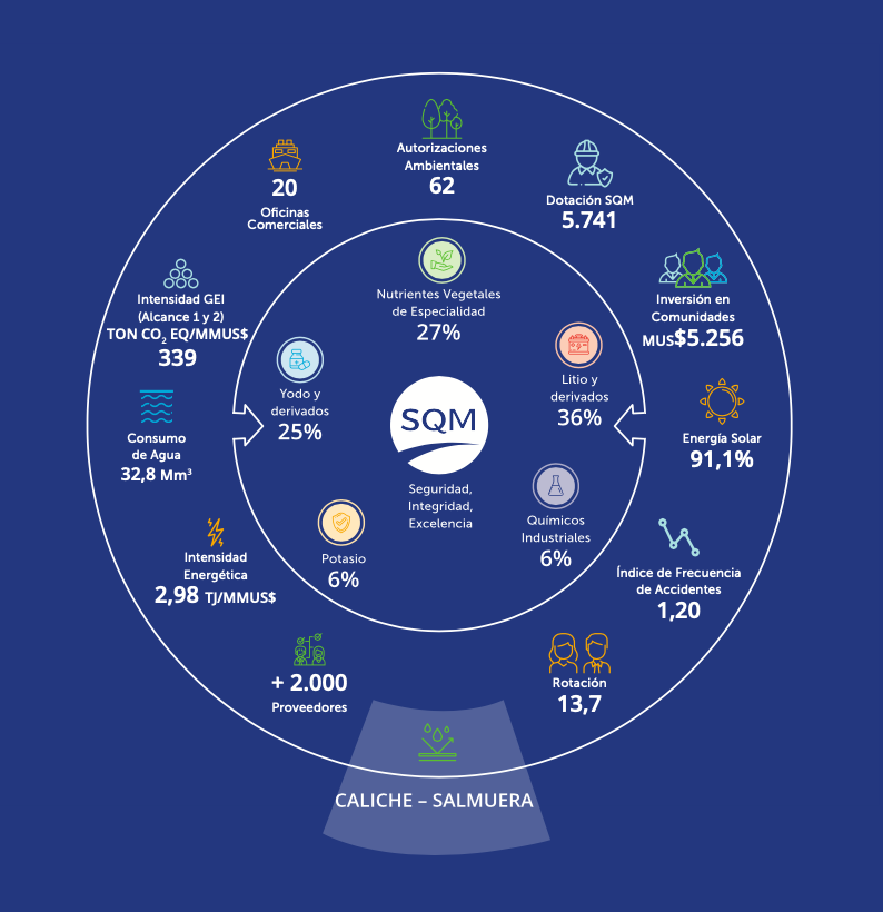 Algunos de los datos más relevantes informados en la nueva versión del reporte es la presencia internacional de SQM en 110 países, que, a partir del caliche y la salmuera del norte de Chile, contribuye a través de sus 5 líneas de negocios a industrias estratégicas para el desarrollo humano: salud, tecnología, alimentación y las nuevas energías que mueven el mundo.