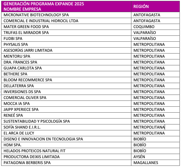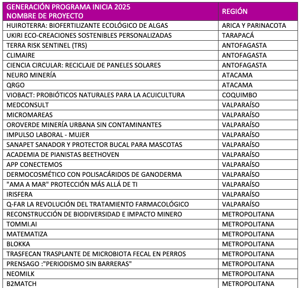 En el caso de Inicia Mujeres 2025, programa que entrega apoyo a emprendimientos innovadores que se encuentren en fase de idea o de prototipo ya desarrollado y sin ventas aún, son 63 los proyectos ganadores que provienen de todo el país. En tanto, en Expande Mujeres, 26 fueron las iniciativas seleccionadas, con emprendimientos que representan a siete regiones. Todos ellos, actualmente, en fase de formalización.