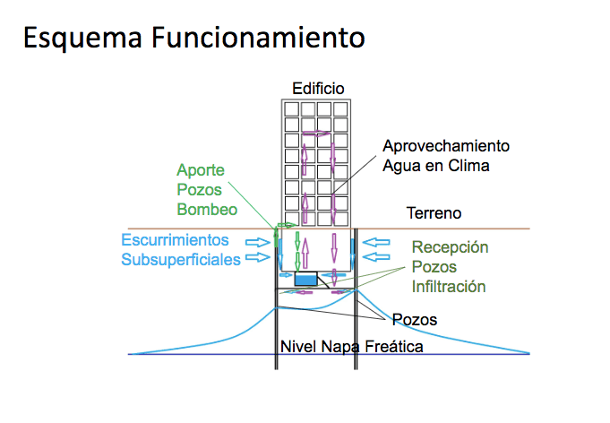El concepto es “uso cero del agua”, es decir, que el volumen que se extrae del acuífero para alimentar el sistema de clima y entregarle la energía necesaria para aumentar la temperatura en el edificio, o disminuirla dependiendo la época del año, se regresa al acuífero y su volumen neto es cero. Esto se conoce como uso no consuntivo del agua. Si bien implica una inversión inicial un poco mayor por los pozos, se paga rápidamente con una reducción considerable del consumo energético del edificio, con un ahorro de energía total del proyecto del orden del 50% por la energía geotérmica.