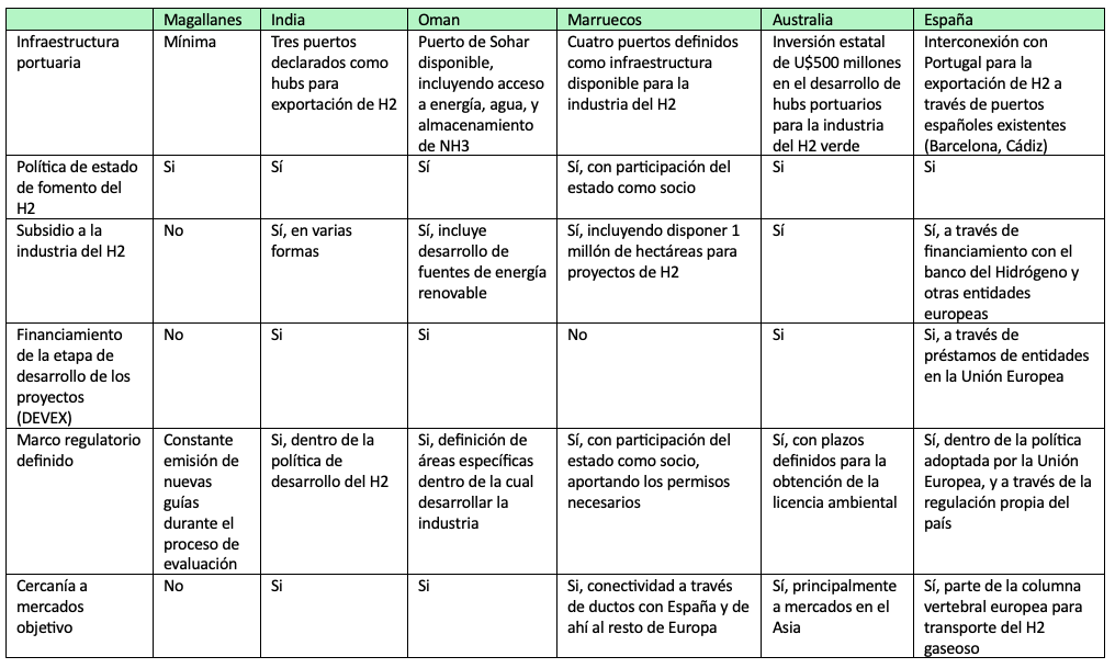 La tabla siguiente muestra de manera resumida las condiciones de base existentes en países competidores con Chile en el desarrollo de la industria del hidrógeno verde y sus derivados.