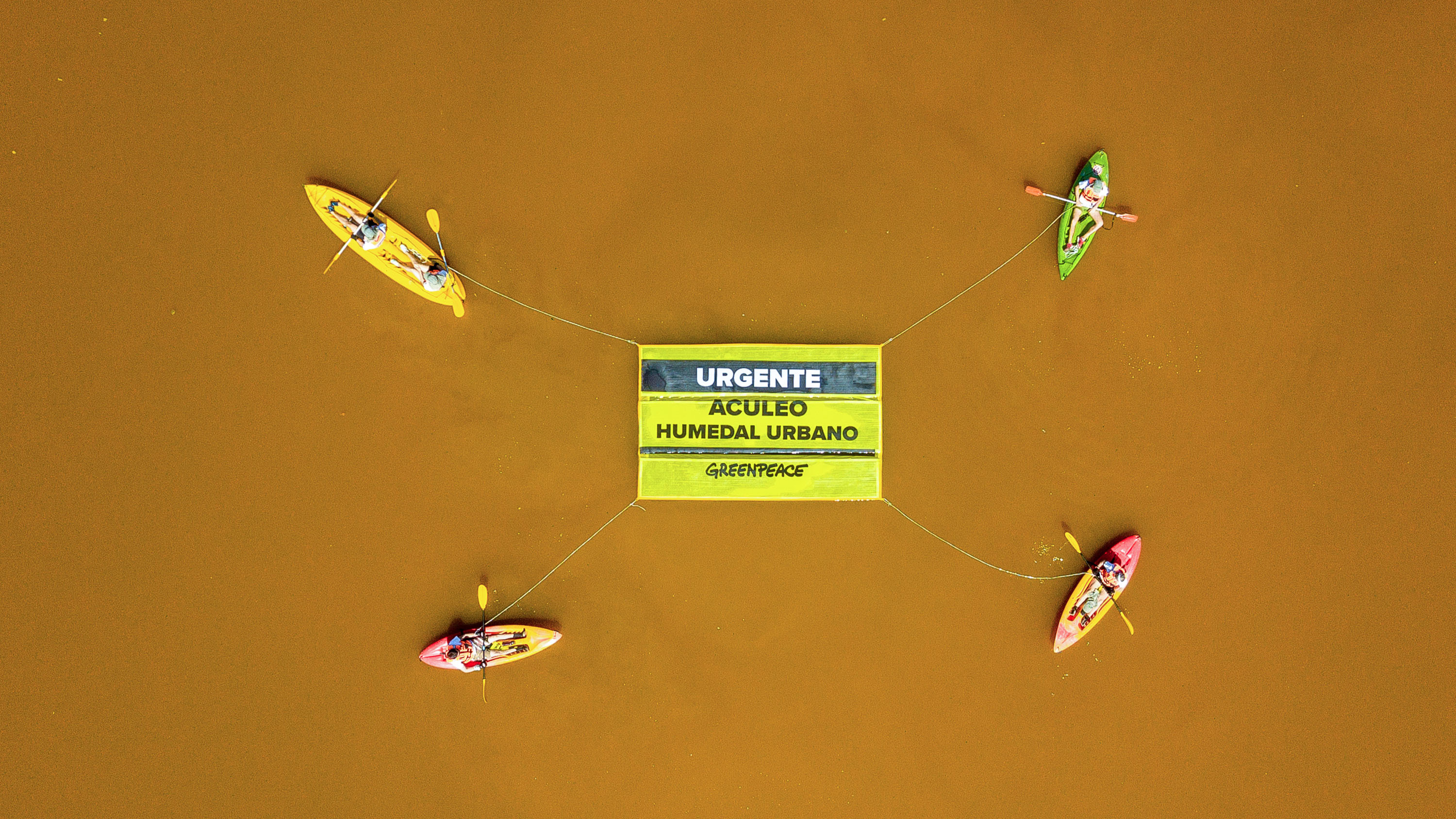 Desplegando un cartel flotante de 5 metros sobre la Laguna de Aculeo, activistas de Greenpeace se sumaron a la iniciativa que busca que este espejo de agua, en conjunto con los esteros Pintué y Santa Marta, sean declarados como humedal urbano y de esta forma, dotarlos de más herramientas jurídicas para su protección.