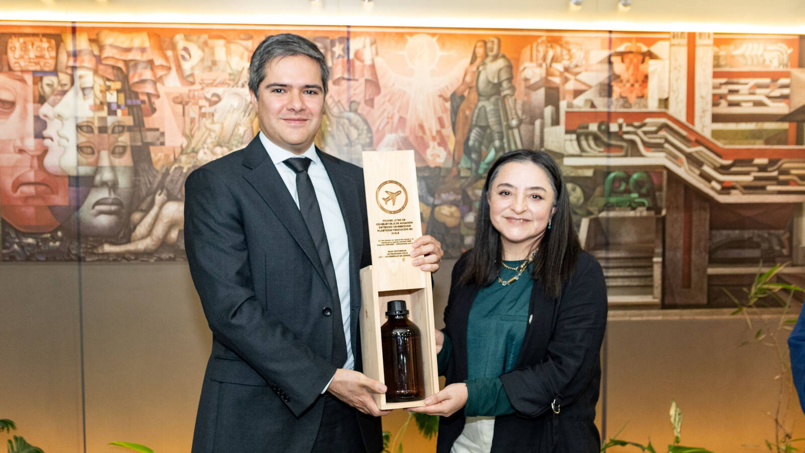 El subsecretario de Energía, Luis Felipe Ramos, recibió en el primer litro de combustible de aviación producido en Chile a partir de residuos plásticos, elaborado por la Unidad de Desarrollo Tecnológico (UDT) de la Universidad de Concepción.