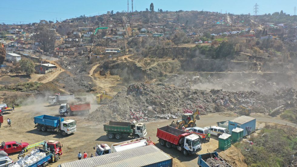 Para fines de febrero, las autoridades del Ministerio de Obras Públicas (MOP) informaban que se había terminado la primera etapa de remoción de escombros tras los incendios en Viña del Mar, Quilpué y Villa Alemana. Fueron un total de 85.000 toneladas las recogidas, de acuerdo a lo señalado en Radio Pauta por el seremi del Ministerio de Obras Públicas (MOP) de Valparaíso, Yanino Riquelme. Esta cifra significaba solo el 70% de la tarea total, según datos del gobierno, y fueron destinados el relleno sanitario El Molle.