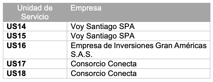 Según establece el Acta de Evaluación Económica y Final, la propuesta de adjudicación para las cinco Unidades de Servicios, que representan el 30% del Sistema Red, es la siguiente: