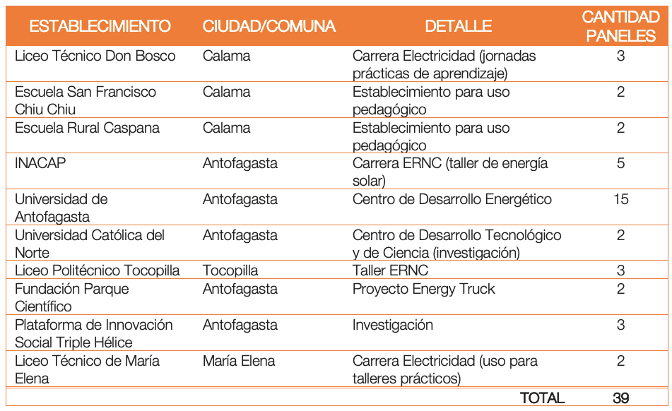 Los beneficiados de este programa serán 10 establecimientos educacionales de la región de Antofagasta y en total se entregarán 39 paneles fotovoltaicos.